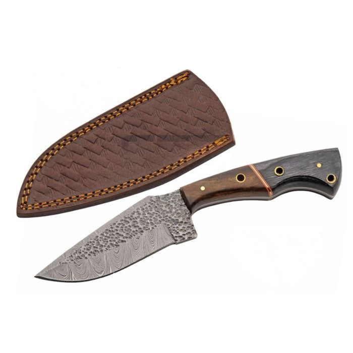 This 8.5" hammerhead real Damascus steel knife is an exceptional and highly functional hunting and camping tool to have. Featuring a stunning hammered Damascus steel blade, this knife showcases superior edge retention and unique patterns. The brown and black wood handle is very comfortable and provides excellent grip control. The full tang construction offers increased durability, reliability, and longevity. Includes a leather sheath for easy carry.