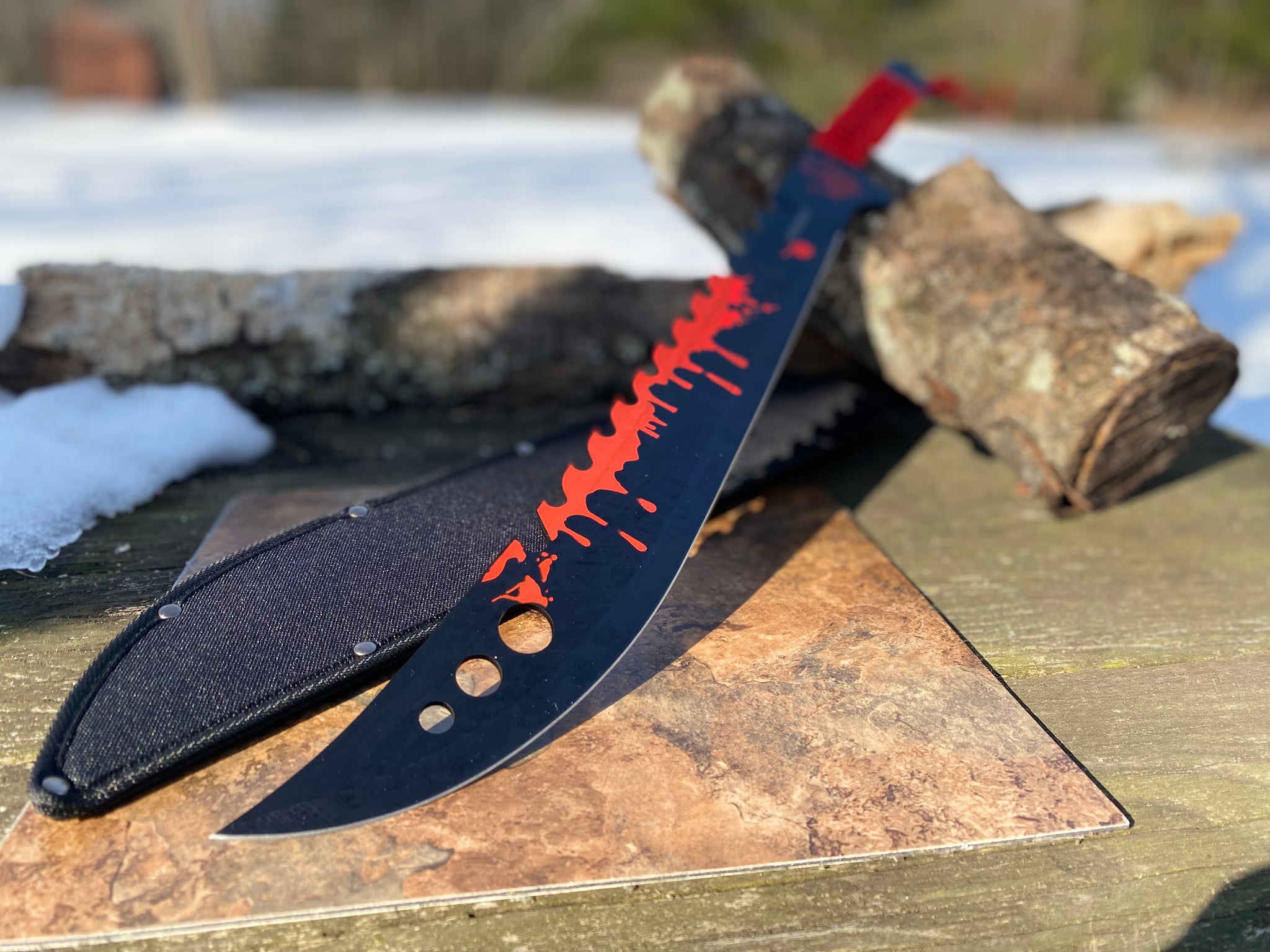 This 25" Z-Hunter red blood splatter zombie survival machete is a great outdoor blade to have. Featuring a long stainless steel blade with blood splatter design and red fabric wrapped handle, this fantasy machete provides an amazing grip and is perfect for outdoor tasks. Comes with a nylon sheath.
