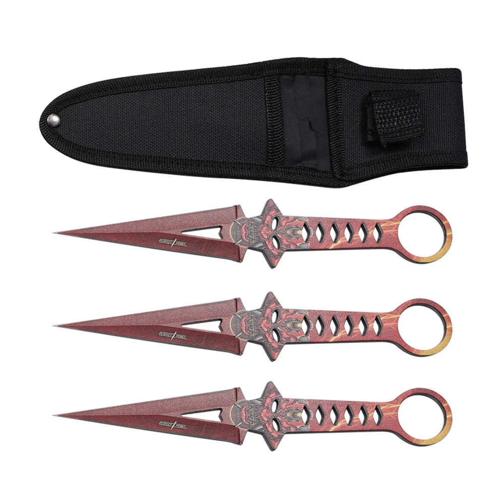 This striking 8-inch kunai set is inspired by the Japanese warrior tradition of precision throwing. Each thrower features a razor-sharp arrow pointed stainless steel blade with the iconic "Perfect Point" logo. The knives are paired with a bold red oni mask design. The full tang construction ensures durability and perfect balance. The complete set includes three kunai throwers, a protective black nylon sheath, and a custom target board emblazoned with the oni mask motif.