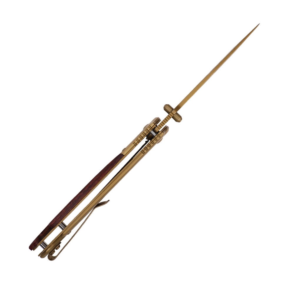 This Tac Force Speedster Model gold acid etched and Tinite-coated spring assisted cool pocket knife is a great folding knife to have. This knife features a blade crafted from 3Cr13MoV steel with an eye-catching acid-etched gold finish and factory engraving. The handle combines a warm brown wood with gold stainless steel accents for a distinctive look. Secured by a liner lock mechanism and equipped with a low-carry pocket clip for everyday carry (EDC). This Tac Force Speedster Model pocket knife delivers both style and functionality in one package.