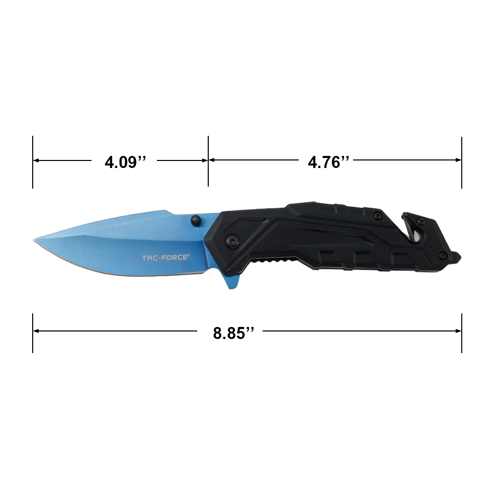 This Tac Force speedster model provides tactical performance for everyday carry (EDC). Featuring a blue tinite-coated drop point blade, this knife is razor sharp. The durable and black nylon fiber acrylic handle highlights a modern and minimalistic look. The integrated glass breaker and rope cutter delivers compact versatility. The liner lock spring assisted mechanism ensures quick and secure blade deployment. Includes a pocket clip for easy accessibility.