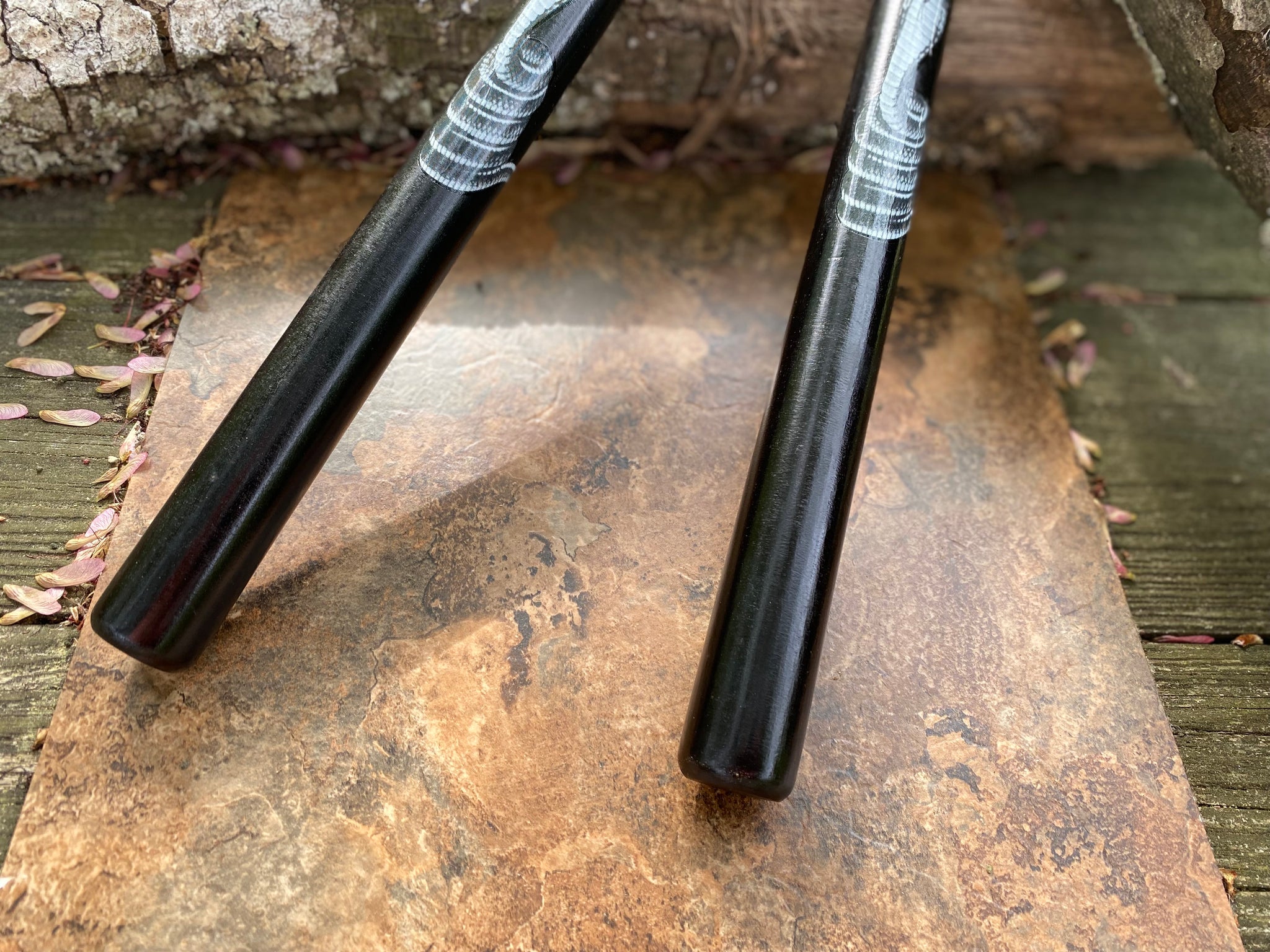 This 12.5" black wooden nunchucks for sale with  Snake Design is great martial arts equipment to have. This wooden nunchucks for sale features black round hardwood handles with ball bearing chain and Snake Design.